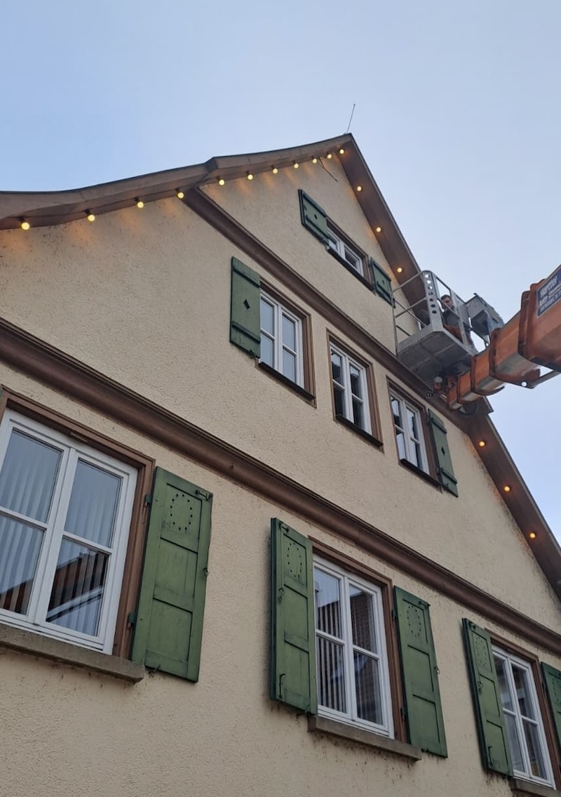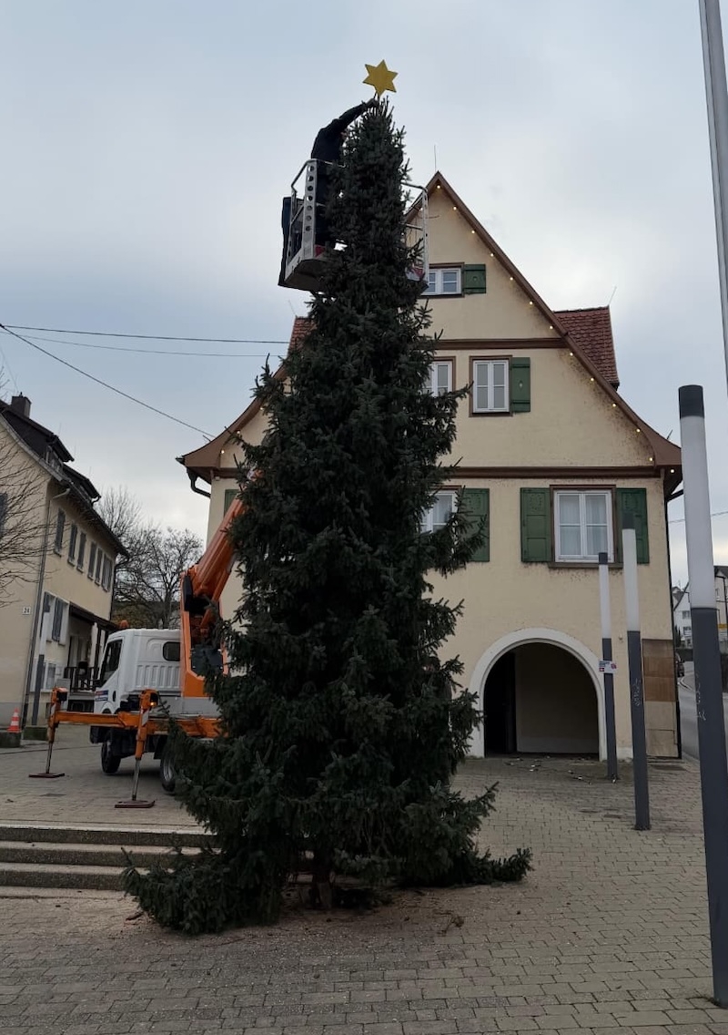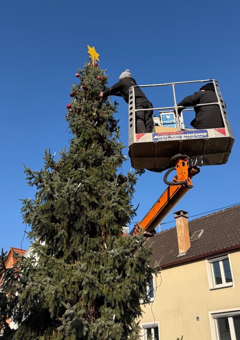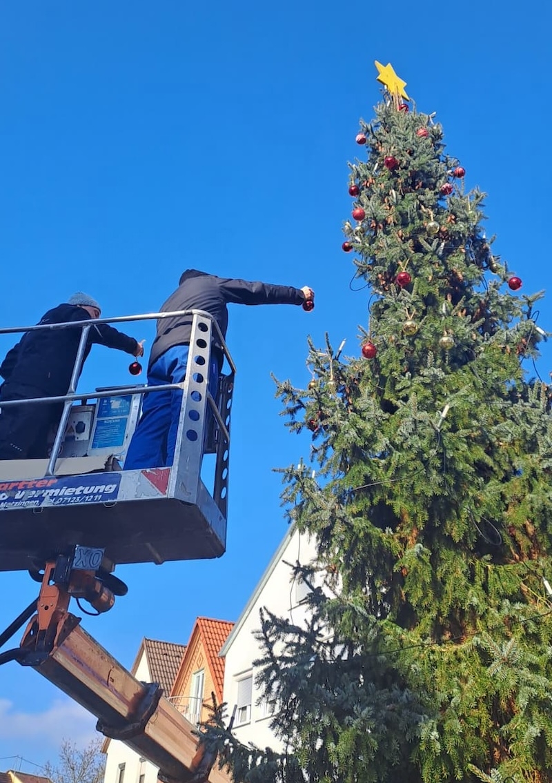 Dieses Jahr haben sich Mitglieder der Narrenzunft Brühlbärbel Mittelstadt zusammengefunden, um den Weihnachtsbaum am Rathaus festlich zu schmücken. Mithilfe einer Hubarbeitsbühne wurden Lichterketten und Weihnachtskugeln sorgfältig angebracht, sodass der bereits am Vortag aufgestellte Baum pünktlich zum Beginn der Adventszeit in weihnachtlichem Glanz erstrahlt.